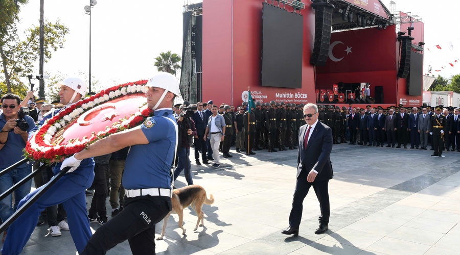 29 Ekim Cumhuriyet Bayramı ve Türkiye Cumhuriyeti'nin kuruluşunun 96’ıncı yıl dönümü kapsamında Cumhuriyet Meydanı'nda çelenk sunma töreni düzenlendi. Törene Vali Münir Karaloğlu, Antalya Milletvekilleri Kemal Çelik, Çetin Osman Budak, Cavit Arı, Rafet Zeybek, Abdurrahman Başkan, Hasan Subaşı, Antalya Büyükşehir Belediye Başkanı Muhittin Böcek, Antalya Tugay ve Garnizon Komutanı Tuncay Polat, Kaymakamlar, İlçe Belediye Başkanları, siyasi parti temsilcileri ve sivil toplum kuruluşları temsilcileri katıldı. Vali Münir Karaloğlu, Garnizon Komutanı Tuncay Polat ve Büyükşehir Belediyesi Başkanı Muhittin Böcek’in meydandaki Atatürk anıtı önüne çelenk sunmasının ardından Saygı Duruşu ve İstiklal Marşı okundu.