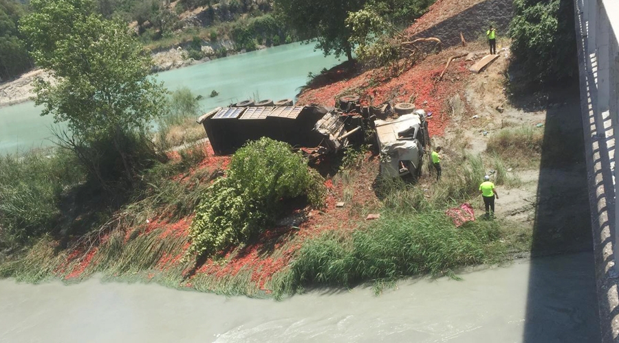 Antalya'nın Kaş ilçesinde köprüden Eşen Çayı kıyısına devrilen domates yüklü TIR'ın şoförü Hacı Musa Demirci (50), yaşamını yitirdi. Kaza, Kaş ile Muğla'nın Seydikemer ilçesini bağlayan Kınık Köprüsü mevkisinde meydana geldi. Hacı Musa Demirci yönetimindeki 01 D 4479 plakalı domates yüklü TIR, sürücünün kontrolünden çıkıp, köprüden yaklaşık 10 metre yükseklikten Eşen Çayı kıyısına devrildi. Yoldan geçen diğer sürücülerin ihbarı üzerine kaza yerine jandarma, itfaiye ve sağlık ekipleri yönlendirildi. Kasasındaki domateslerin etrafa saçıldığı TIR’ın şoförü Hacı Musa Demirci'nin yaşamını yitirdiği belirlendi. Araçtan çıkarılan Demirci'nin cenazesi morga konuldu.