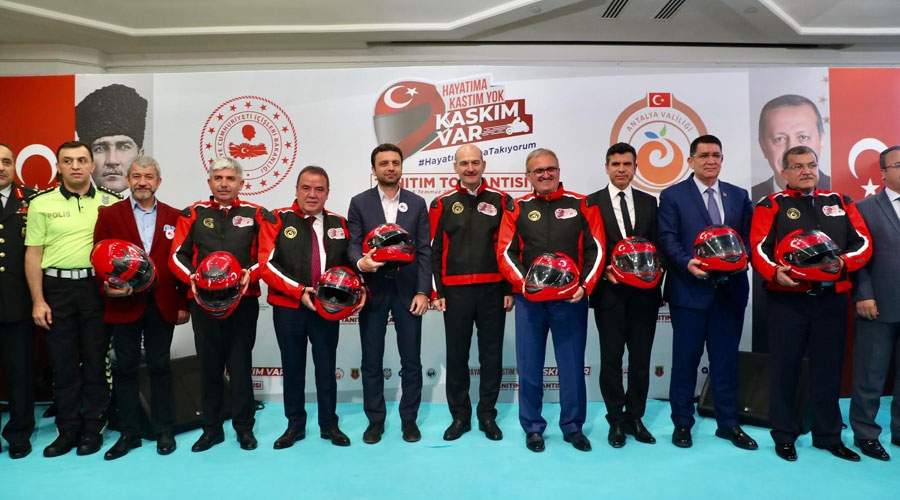 İçişleri Bakanı Süleyman Soylu, “Hayata Kastım Yok, Kaskım Var” Projesinin Antalya’da düzenlenen tanıtım toplantısına katıldı. Proje ile kask kullanımının, trafik kazaları sebebiyle meydana gelen yaralanma ve ölümleri büyük oranda azaltabileceğinin farkına varılması ve motosiklet sürücülerinin kask olmadan trafiğe çıkmamaları hedefleniyor. Düzenlenen toplantıya Emniyet Genel Müdürü Celal Uzunkaya, Antalya İl Emniyet Müdürü Mehmet Murat Ulucan, Antalya Valisi Münir Karaloğlu, Antalya Büyükşehir Belediye Başkanı Muhittin Böcek, Antalya İl Milli Eğitim Müdürü Yüksel Arslan da katıldı.